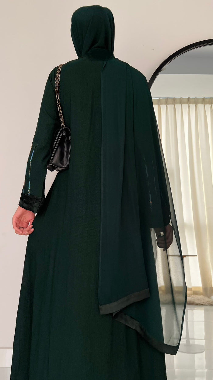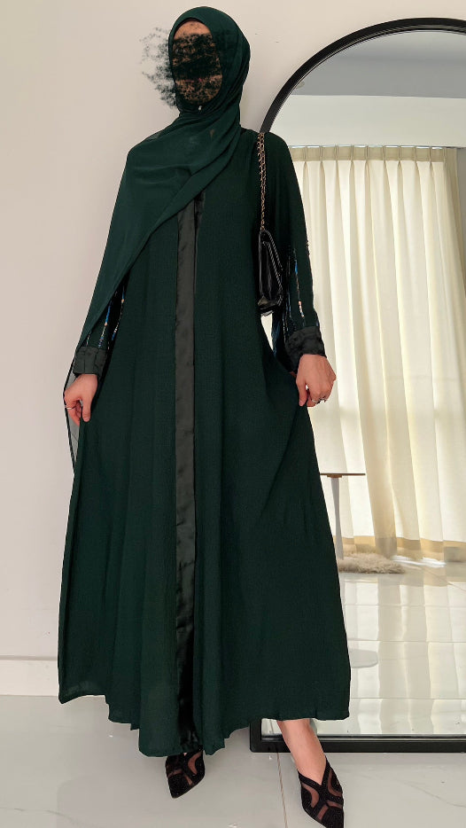 Step into elegance with this semi-formal green abaya, designed to give you a graceful and royal look. Made from soft, flowy fabric, it features beautiful embroidery on the sleeves and back, adding a touch of sophistication to your modest style. Perfect for special gatherings, events, or evening outings, this abaya blends tradition with modern charm.