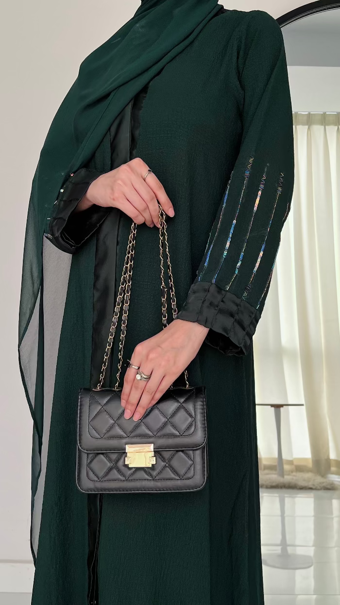 Step into elegance with this semi-formal green abaya, designed to give you a graceful and royal look. Made from soft, flowy fabric, it features beautiful embroidery on the sleeves and back, adding a touch of sophistication to your modest style. Perfect for special gatherings, events, or evening outings, this abaya blends tradition with modern charm.